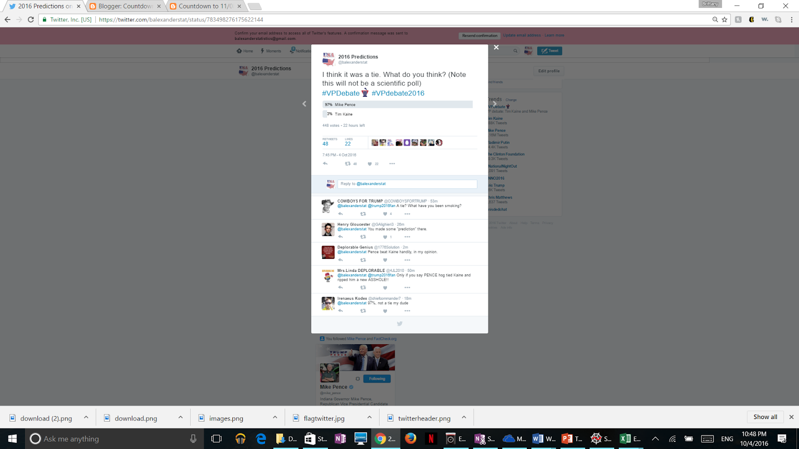 I have a twitter account for posting some blog posts and following comments, and the occasional straw poll (not for official use but for more of a feel). I posted two polls tonight about who won the debate, one with just Pence and Kaine and another with Pence, Kaine and no one (to provide another option). This poll began to attract negative and unfair comments from anonymous accounts that have no relation to the poll itself. At time the posting the poll showed 96% and 97% for Pence. I believe that this is because numerous accounts with words that suggested strong political views. I am not deleting the account but I am no longer using it to post, because I don't think anything beneficial can come of it. If you want to see my account for reference my handle is @balexanderstat . I am turning off comments on this post. I am attaching screenshots of some of the posts for record. This not mean that I will let this stop the work I am doing. I will just stick to this blog.